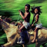 Δύο παιδιά ιππεύουν ένα άλογο και χαμογελούν στον φωτογραφικό φακό. Δεν έχουν κάποια προστασία και φαίνεται να απολαμβάνουν τη βόλτα. Το αγόρι μοιάζει να είναι έμπειρος ιππέας. Είναι γυμνό από τη μέση και πάνω, ενώ το κορίτσι κάθεται πίσω του και κρατιέται από τη σέλα. Τα μαλλιά και τα ελαφριά της ρούχα ανεμίζουν στον αέρα και είναι ξυπόλυτη. Η φωτογραφία τραβήχτηκε…