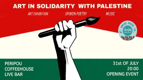 Από την Τετάρτη, 31 Ιουλίου στο CoffeeHouse Bar «Peripou», στον Άγιο Νικόλαο Μετά το 1ο Φεστιβάλ Ανεξάρτητου Παλαιστινιακού Κινηματογράφου PIFF AGIOS NIKOLAOS, η οργανωτική επιτροπή του Αντιρατσιστικού Φεστιβάλ Αγίου Νικολάου προχωράει σε ένα ακόμα καλλιτεχνικό κάλεσμα, διοργανώνοντας την έκθεση με τίτλο “Art in Solidarity with Palestine” σε επιμέλεια της Φαίης Ευδαίμων. Από την Τετάρτη, 31 Ιουλίου και για ένα μήνα, o Πολυχώρος «Peripou» θα φιλοξενεί έργα από διαφορετικές εκφάνσεις της Τέχνης (κολλάζ, ψηφιδωτά, digital art, ποίηση σε καμβά, installations κα). Στο opening…