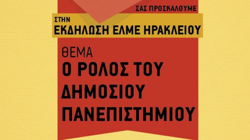 Εκδήλωση της ΕΛΜΕ Ηρακλείου Εκδήλωση θα πραγματοποιήσει η ΕΛΜΕ Ηρακλείου το Σάββατο 29 Φεβρουαρίου 2020 και ώρα 19.00 στο Πολύκεντρο Νεολαίας, με θέμα: «Ο ρόλος του Δημόσιου Πανεπιστημίου». Ομιλητές: Νίκος Κατσαράκης, Πρύτανης του Ελληνικού Μεσογειακού Πανεπιστημίου Θέμα: «Ελληνικό Μεσογειακό Πανεπιστήμιο: Η Ίδρυση, ο πρώτος χρόνος λειτουργίας, το όραμα» Μιχάλης Παυλίδης, Καθηγητής Πανεπιστημίου Κρήτης, πρόεδρος του τμήματος Βιολογίας Θέμα: «Το Δημόσιο…
