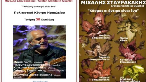 “Κόσμος κι όνειρο είναι ένα” Το συγκρότημα “Μιχάλης Σταυρακάκης – Cretan Mandolin Quartet” και η Περιφέρεια Κρήτης, διοργανώνουν συναυλία στις 30 του Οκτώβρη, στο Πολιτιστικό Κέντρο Ηρακλείου με γενικό τίτλο “Κόσμος κι όνειρο είναι ένα”. Η συναυλία είναι με ελεύθερη είσοδο για το κοινό και η έναρξη στις 21:30. Τα μέλη του συγκροτήματος Μιχάλης Σταυρακάκης – μαντολίνο, τραγούδι Μαρία Κώτη…