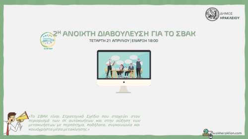 Η 2η Διαδικτυακή Διαβούλευση ΣΒΑΚ (Σχέδιο Βιώσιμης Αστικής Κινητικότητας) του Δήμου Ηρακλείου πρόκειται να πραγματοποιηθεί την Τετάρτη 21 Απριλίου 2021 και ώρα 18:00. Η πρώτη είχε πραγματοποιηθεί στα μέσα Σεπτεμβρίου του 2020 με μεγάλη συμμετοχή φορέων. Στην αυριανή 2η Διαδικτυακή Διαβούλευση ΣΒΑΚ θα παρουσιαστούν οι βασικές προτάσεις του Σχεδίου με στόχο να επιλεγεί από κοινού με τους φορείς το επικρατέστερο σενάριο…