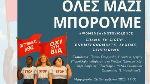 Ανοιχτή Εκδήλωση στο πλαίσιο του Εργου «STOP VIOLENCE PROJECT» Ο «Σύνδεσμος Μελών Γυναικείων Σωματείων Ηρακλείου και Ν. Ηρακλείου» διοργανώνει ανοικτή εκδήλωση ενημέρωσης και ευαισθητοποίησης, στο πλαίσιο του Έργου «STOP VIOLENCE PROJECT», που υλοποιείται με στόχο την πρόληψη της έμφυλης βίας και την ενεργοποίηση των τοπικών κοινωνιών. Η εκδήλωση θα πραγματοποιηθεί την Παρασκευή 26 Σεπτεμβρίου 2025, στις 17.00, στο Πάρκο Γεωργιάδη…
