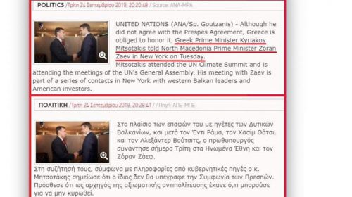 Περίεργα πράγματα συμβαίνουν και πάλι στο Αθηναϊκό Πρακτορείο Ειδήσεων που φαίνεται να έχει διασπαστεί σε ΑΠΕ Εσωτερικού και ΑΠΕ Εξωτερικού, με αφορμή τη Βόρεια Μακεδονία. Σύμφωνα με το ΑΠΕ Εσωτερικού «στο πλαίσιο των επαφών του με ηγέτες των Δυτικών Βαλκανίων, και μετά τον Έντι Ράμα, τον Χασίμ Θάτσι, και τον Αλεξάντερ Βούτσιτς, ο πρωθυπουργός συνάντησε σήμερα Τρίτη στα Ηνωμένα Έθνη και τον Ζόραν Ζάεφ». Τον Ζόραν…