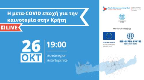 Διαδικτυακή εκδήλωση διοργανώνει το YouthEntrepreneurship Club Έχοντας επιστρέψει στην ενεργό δράση, το YouthEntrepreneurship Club διοργανώνει την Τρίτη 26 Οκτωβρίου 2021 και ώρα 19:00 διαδικτυακή εκδήλωση ανάμεσα σε σημαντικά πρόσωπα του περιφερειακού οικοσυστήματος καινοτομίας της Κρήτης, με τίτλο: «Η μετα–COVID εποχή για την καινοτομία στην Κρήτη». Η εκδήλωση πραγματοποιείται με την υποστήριξη της Περιφέρειας Κρήτης και του EuropeDirect Περιφέρειας Κρήτης και αποτελεί μέρος του StartupEurope Week για την Ευρωπαϊκή Εβδομάδα Καινοτομίας και Επιχειρηματικότητας, ενώ υπάγεται στο πλαίσιο ενδυνάμωσης της…
